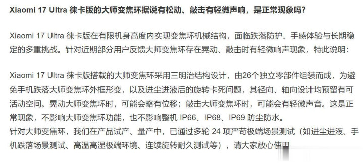再来看小米17 Ultra徕卡版变焦环松动问题,小米官方回应,由于手机在有限机身高度内实现变焦环机械结构,面临跌落防护、手感体验与长期稳定多重挑战。为了避免手机跌落时变焦环外框变形,以及进尘进液导致旋转卡死问题,略有移位属于正常现象。小米17 Ultra徕卡版敲击变焦环有轻微声音,非常正常,不影响防尘防水功能,不影响变焦功能,用户完全可以放心使用。