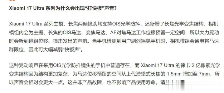 面对网友质疑,小米官方正面回应。认为小米17 Ultra系列主摄、长焦两颗镜头均支持OIS光学防抖,首次支持长焦光学变焦结构。由于采用全新设计,相机模组需要留出更多空间,所以大力晃动时听到镜主位移,撞击发生的响声。为避免声音影响过大,相机模组通电将马达群限位减弱“快板声”,是正常现象,不是故障,不影响使用。