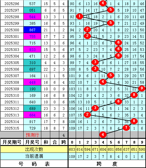 福彩3D第2025315期最大跨度开出7,近期最大跨度波动较大,本期预计最大跨度在1-5区段出现,最大跨度关注12345,重点关注跨度4。