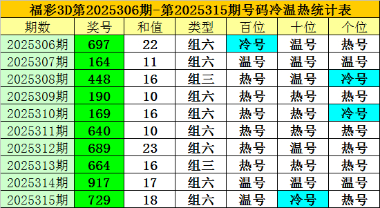 上期回顾:福彩3D第2025315期开奖奖号为:729,奖号类型为:组六,奖号冷温热态为:温号+冷号+热号。